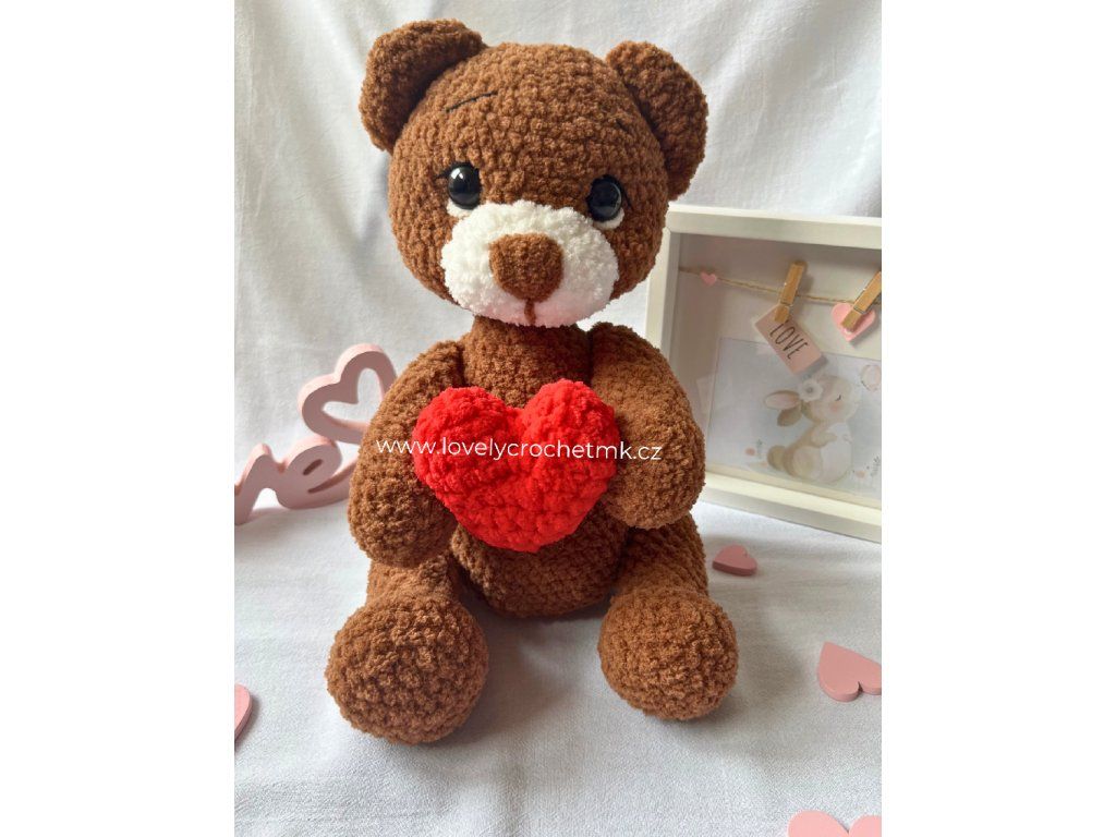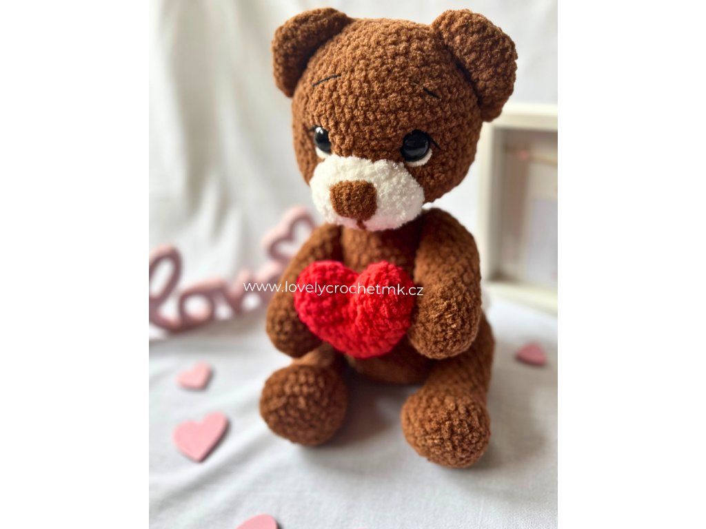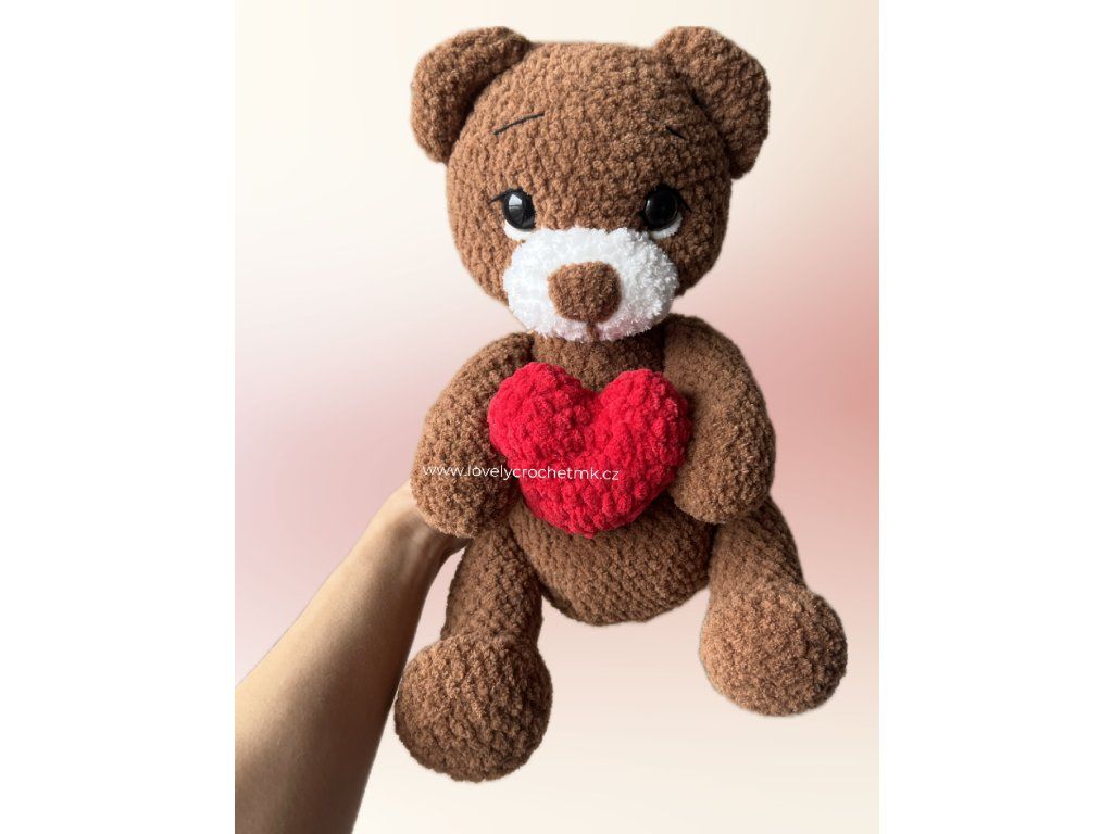 Tento ručně háčkovaný medvídek je něžný plyšový společník, který rozdává lásku na první pohled. Sedící medvídek drží v tlapkách červené srdíčko jako symbol náklonnosti. Je vyroben z certifikované chlupaté žinylkové příze, která je mimořádně hebká a příjemná na dotek, a vyplněn hypoalergenním vláknem pro maximální pohodlí. Díky pečlivému ručnímu zpracování a splnění požadavků na bezpečnost hraček a označení CE je nejen krásným dárkem z lásky, ale také bezpečným plyšovým kamarádem pro malé i velké.