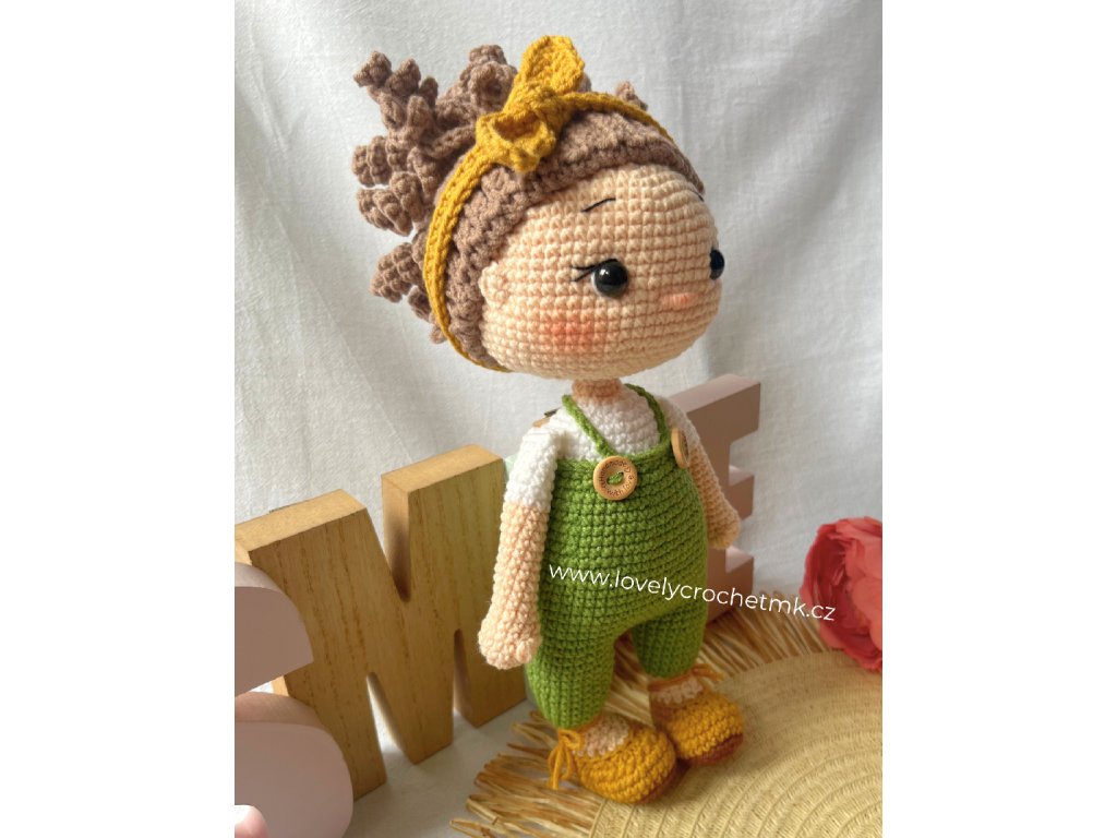 Panenka má hnědé kudrnaté vlasy stažené do vysokého culíku, doplněné roztomilou čelenkou s mašlí. Oblečená je do kalhot na kšandy, které zdobí drobné knoflíčky, což jí dodává hravý a stylový vzhled. Uvnitř krku je pevná plastová konstrukce, která je bezpečná a díky které hlavička krásně drží . Panenka je tak nejen krásná, ale i funkční a vhodná na každodenní hraní i jako designový doplněk do dětského pokoje.
