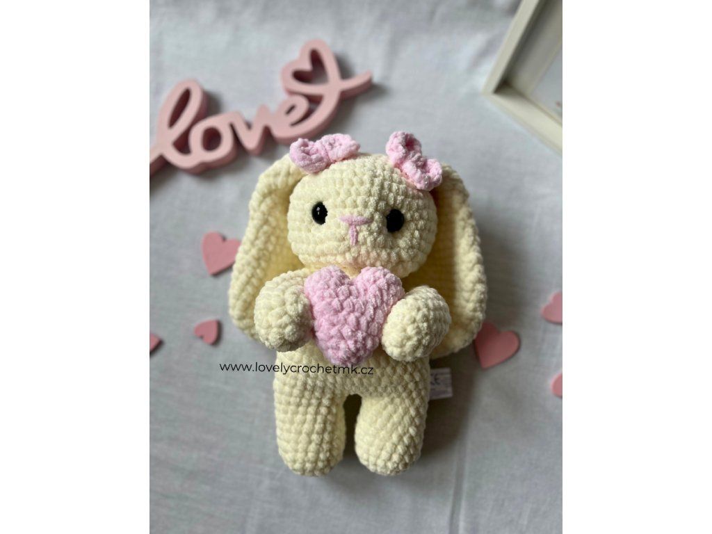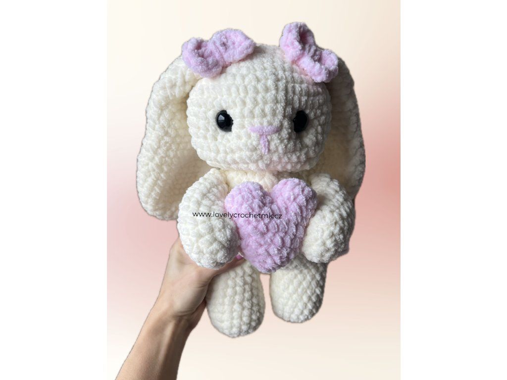 Tento ručně háčkovaný žinylkový králíček si získá srdce na první pohled. Je vyroben z certifikované žinylkové příze, která je hebká a příjemná na dotek a v tlapkách drží růžové srdíčko jako symbol lásky. Uvnitř se nachází hypoalergenní výplň, která je vhodná i pro alergiky. Díky bezpečnostním očím a pečlivému zpracování je nejen krásný, ale i bezpečný, a splňuje evropské normy a nese označení CE. Vhodný jako dárek z lásky nebo dětská hračka.